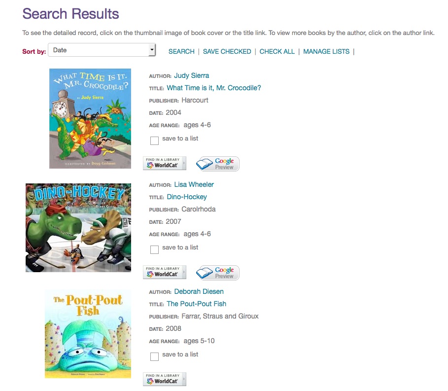 Depending on your search parameter, the results page displays up to 10 titles by default. To see the detailed record, click on the thumbnail image of book cover or the title link. To view more books by the author, click on the author link. -